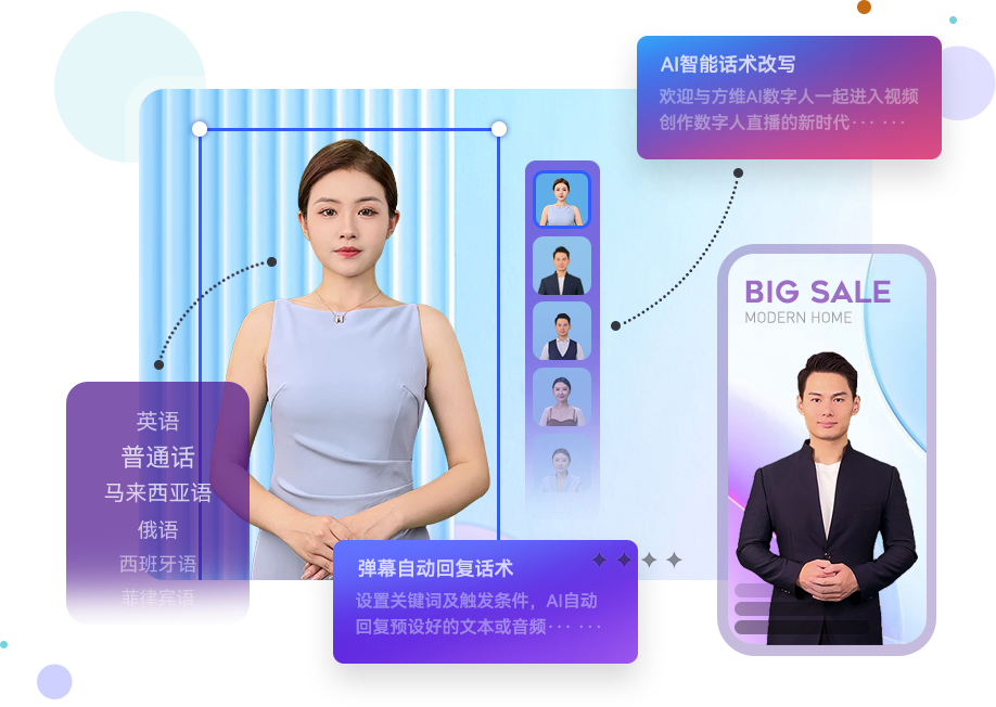 AI數字人定制 / 數字人直播 / AI短視頻生產 / AI語音合成 / 場景化模板 / 智能腳本